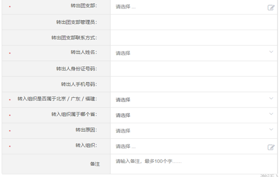 第三步:填写接转信息。所有表红色*信息必须完整填写才能转出,其中团支部只能选择本班团支部,转出原因必须正确选择,并按照下图指示填写。